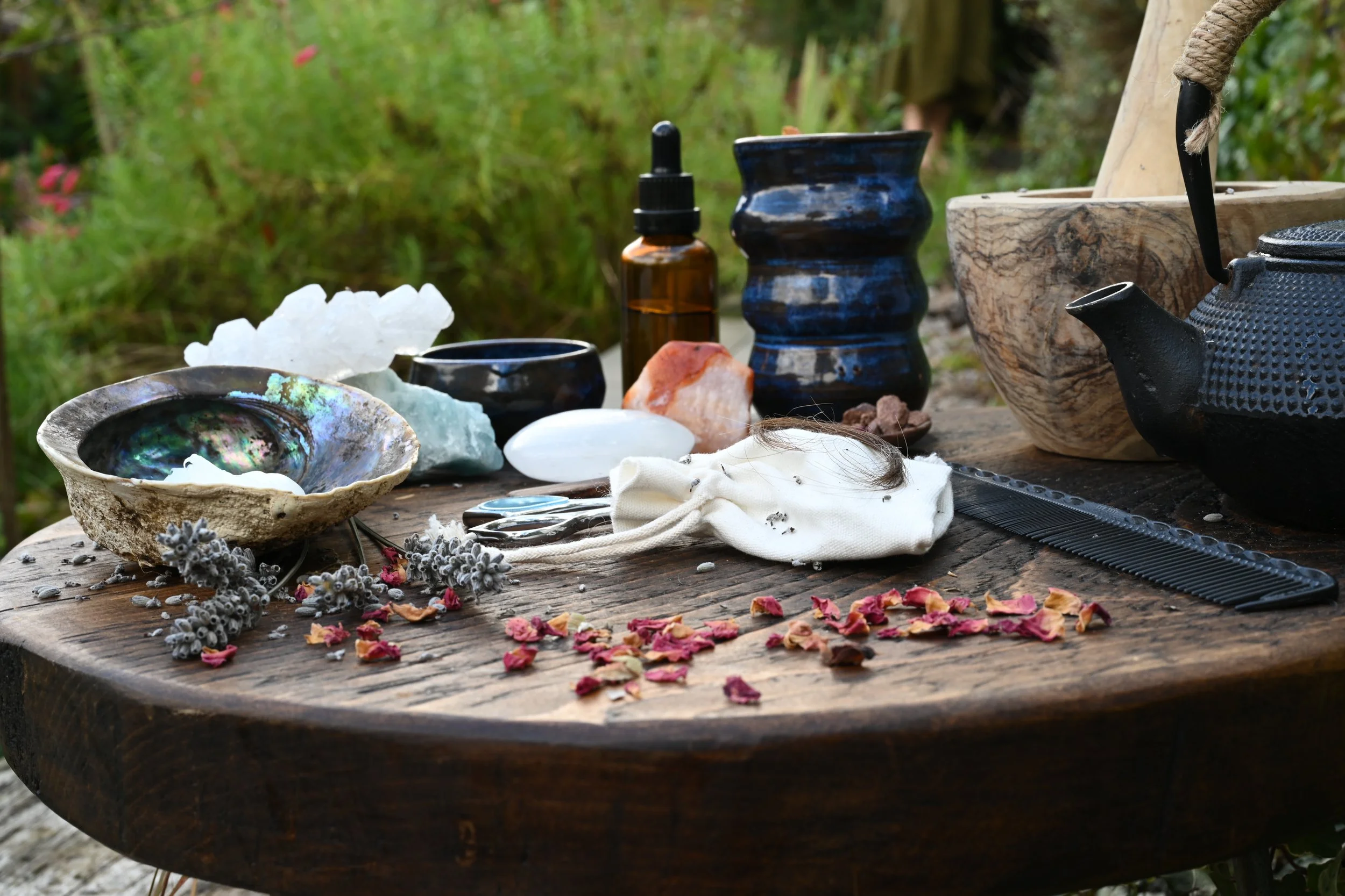 A rustic wooden table with various items, including crystals, an abalone shell, a dropper bottle, a black teapot, dried flowers, a mortar and pestle, a comb, and a cloth pouch, set against a backdrop of greenery.