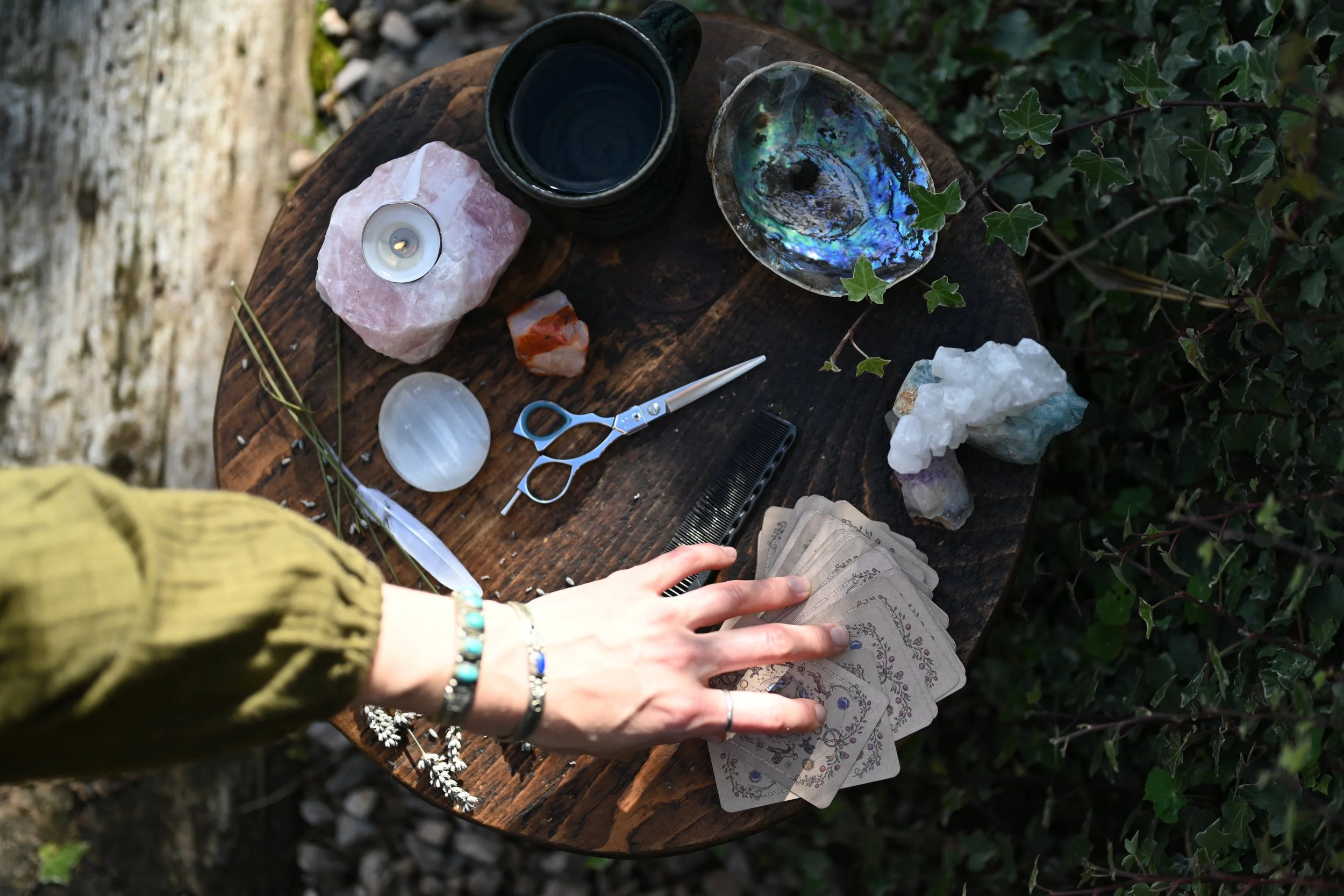 Hand reaching for tarot cards on round wooden table with crystals, candle, scissors, and cup, surrounded by foliage.