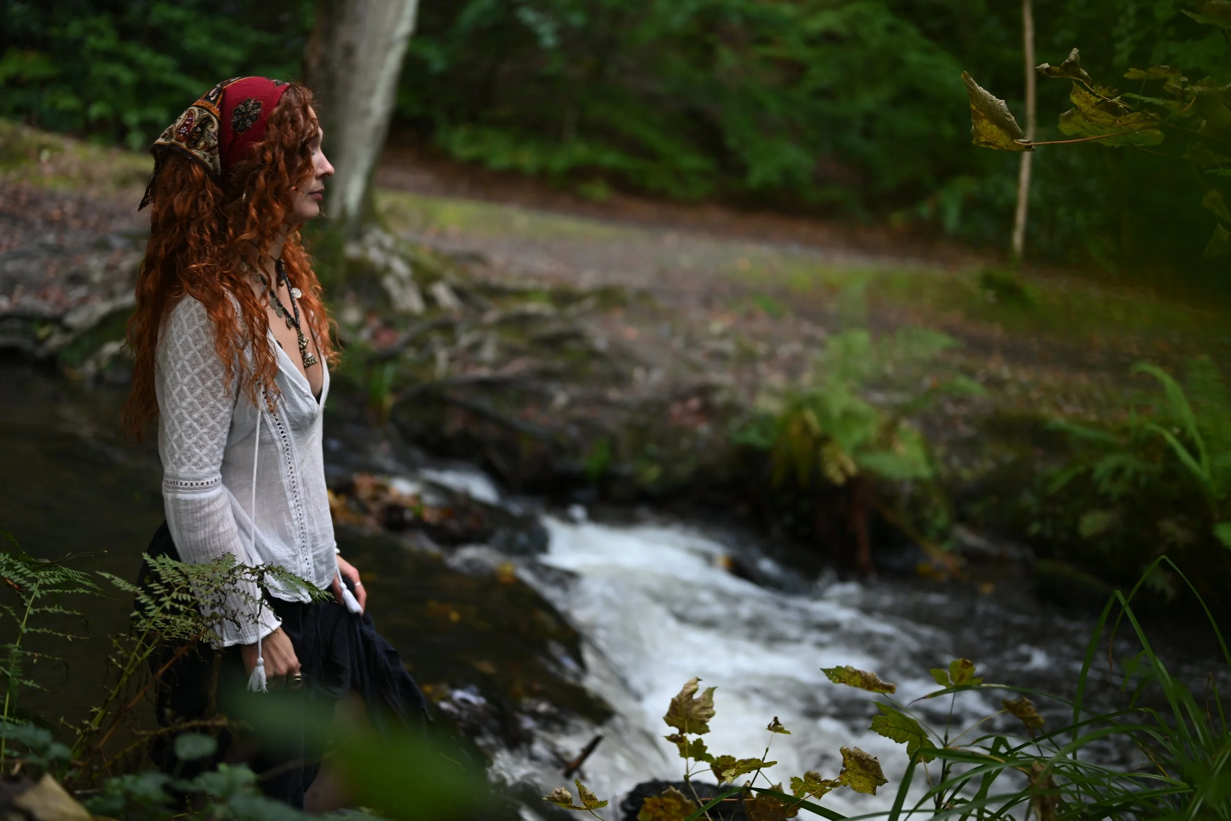 Person with curly red hair in green dress sitting outdoors by table with herbs and pottery, surrounded by nature.